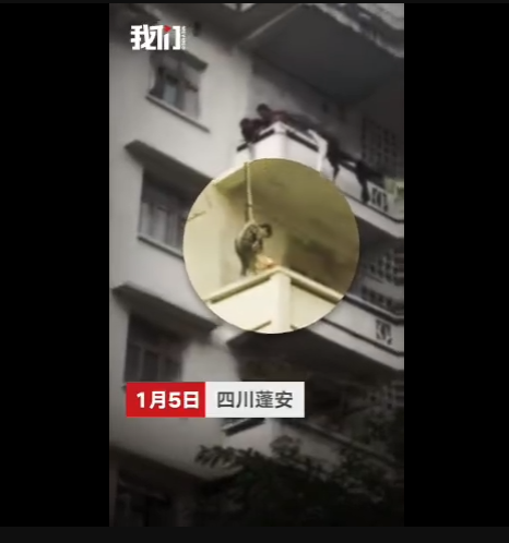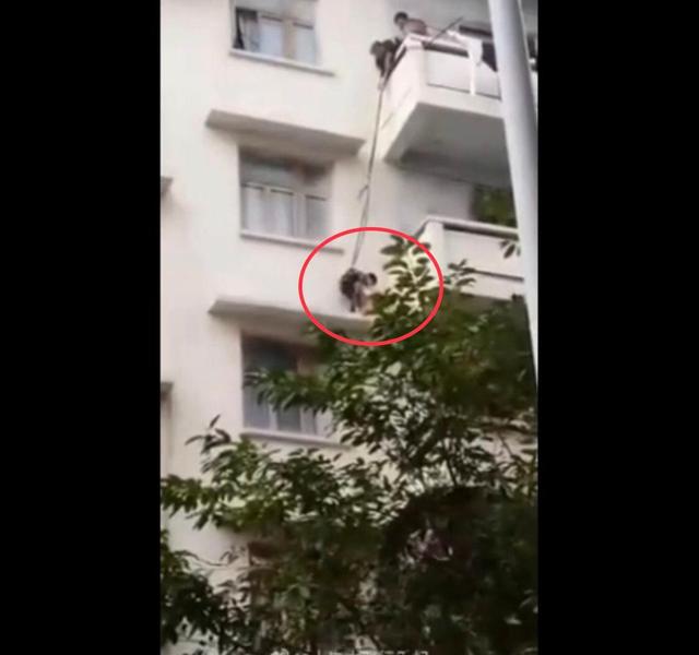 一只貓跑到了百順街老百貨公司宿舍樓三樓的窗戶遮雨臺上,被5樓的老太太發(fā)現(xiàn),老太太善心發(fā)作,竟將孫子用繩子吊起,從5樓慢慢放至3樓救貓,整個(gè)過程不禁令人捏汗。