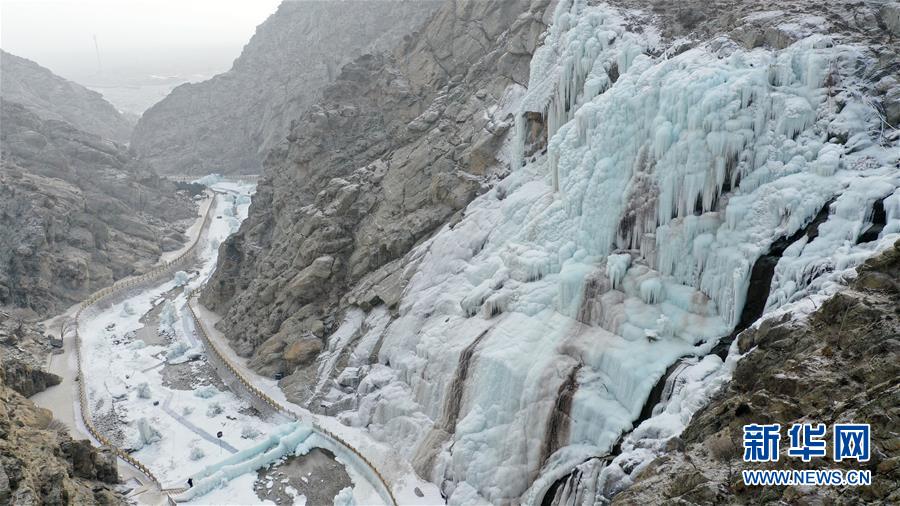 這是1月7日拍攝的賀蘭山巖畫景區(qū)內(nèi)的冰瀑景觀(無人機照片)。 新華社記者 王鵬 攝