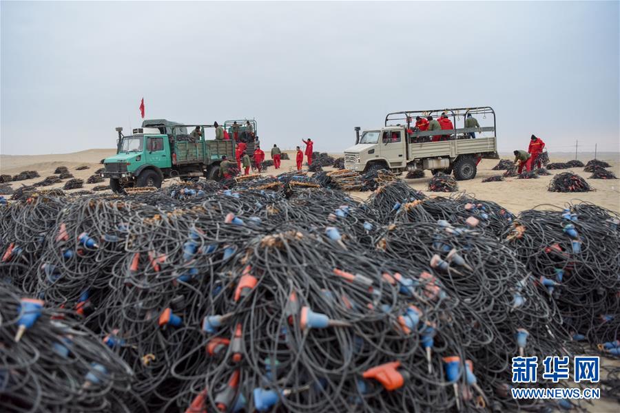 1月14日,放線工在出工前將一捆捆檢波器裝車(chē)。地球物理勘探是油氣開(kāi)發(fā)的第一步,相當(dāng)于給地球做CT。物探工人按照嚴(yán)格的測(cè)線部署,在相應(yīng)位置鉆井,然后實(shí)施地震,采集地震波數(shù)據(jù)??蒲腥藛T通過(guò)數(shù)據(jù)組成的“CT片”,就能夠清晰地“看”到地下的地質(zhì)結(jié)構(gòu),判斷哪里埋藏有石油或者天然氣。2019年10月,東方地球物理勘探有限責(zé)任公司塔里木物探處2113隊(duì)進(jìn)入新疆塔克拉瑪干沙漠腹地,開(kāi)始中古14-21、塔中2兩個(gè)區(qū)塊的三維地震勘探。近2000名物探工人將在1000平方公里的范圍內(nèi)一直工作到2020年4月,這也意味著他們將在塔克拉瑪干沙漠腹地連續(xù)度過(guò)第14個(gè)除夕夜。蘊(yùn)藏著豐富石油天然氣資源的新疆塔克拉瑪干沙漠有“死亡之海”之稱,氣候干燥,年降水量在50毫米以下,冬季地表最低溫度超過(guò)零下30攝氏度,是世界油氣勘探難度最大的地區(qū)之一。為避開(kāi)風(fēng)季,物探工人每年9、10月份進(jìn)入沙漠,一直工作到來(lái)年4月,夜以繼日與黃沙、嚴(yán)寒為伴,用辛勤的汗水,為祖國(guó)找油找氣。新華社記者丁磊攝