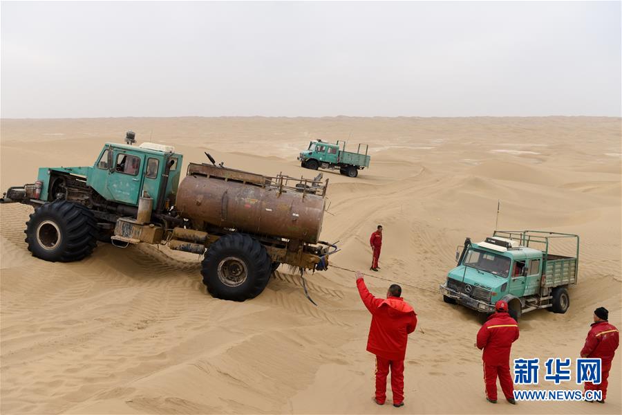 一輛測(cè)量作業(yè)車(chē)陷在沙坑中,水罐車(chē)進(jìn)行營(yíng)救(1月13日攝)。地球物理勘探是油氣開(kāi)發(fā)的第一步,相當(dāng)于給地球做CT。物探工人按照嚴(yán)格的測(cè)線部署,在相應(yīng)位置鉆井,然后實(shí)施地震,采集地震波數(shù)據(jù)。科研人員通過(guò)數(shù)據(jù)組成的“CT片”,就能夠清晰地“看”到地下的地質(zhì)結(jié)構(gòu),判斷哪里埋藏有石油或者天然氣。2019年10月,東方地球物理勘探有限責(zé)任公司塔里木物探處2113隊(duì)進(jìn)入新疆塔克拉瑪干沙漠腹地,開(kāi)始中古14-21、塔中2兩個(gè)區(qū)塊的三維地震勘探。近2000名物探工人將在1000平方公里的范圍內(nèi)一直工作到2020年4月,這也意味著他們將在塔克拉瑪干沙漠腹地連續(xù)度過(guò)第14個(gè)除夕夜。蘊(yùn)藏著豐富石油天然氣資源的新疆塔克拉瑪干沙漠有“死亡之?!敝Q,氣候干燥,年降水量在50毫米以下,冬季地表最低溫度超過(guò)零下30攝氏度,是世界油氣勘探難度最大的地區(qū)之一。為避開(kāi)風(fēng)季,物探工人每年9、10月份進(jìn)入沙漠,一直工作到來(lái)年4月,夜以繼日與黃沙、嚴(yán)寒為伴,用辛勤的汗水,為祖國(guó)找油找氣。新華社記者丁磊攝