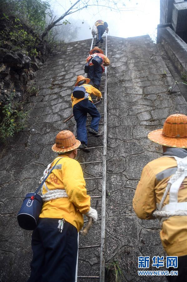 1月14日,百色工務(wù)段白水河橋隧工區(qū)班組成員攀梯上山開展巡查工作。在中國鐵路南寧局集團公司百色工務(wù)段白水河橋隧工區(qū),有一個由14名工人組成的班組。他們常年像“爬山虎”一樣行走攀爬在地形險峻、云霧繚繞的高山上,負責(zé)南昆鐵路轄區(qū)路段的搜山掃石工作,清除一切可能危害鐵路行車安全的因素,保障旅客出行安全。新華社記者張愛林攝