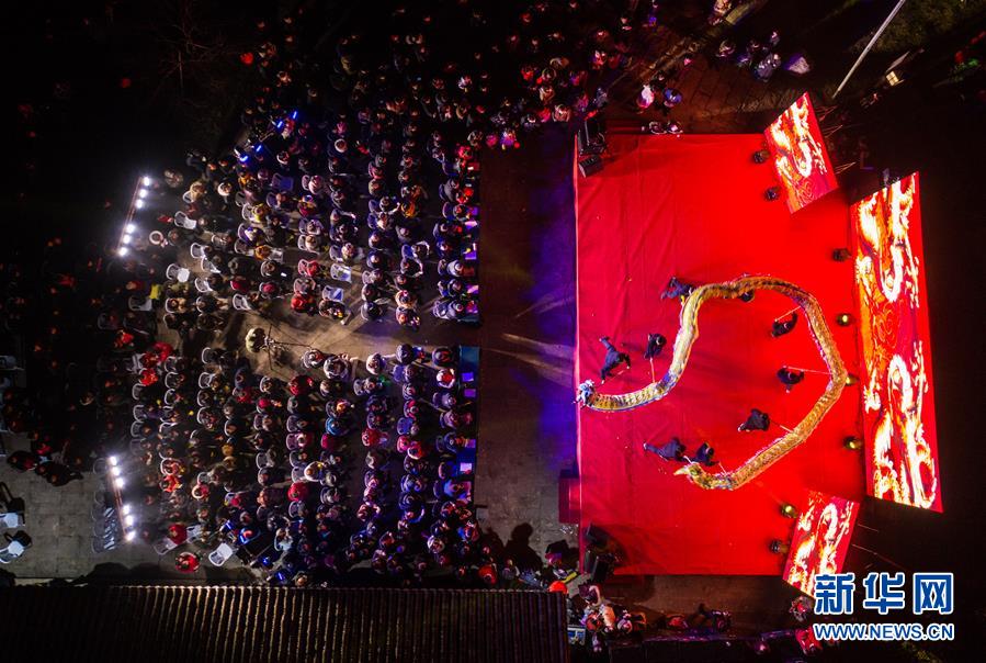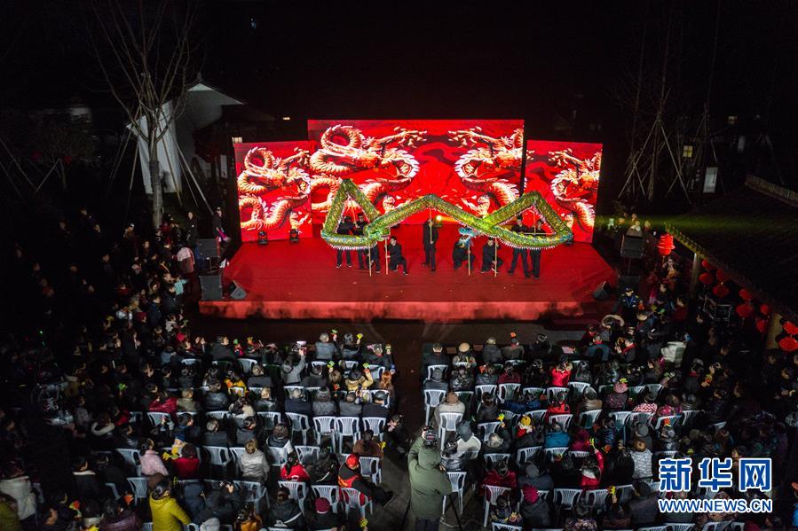 1月14日,杭州市余杭區(qū)中泰街道中橋村的文化公園內(nèi)在進行“我們的村晚”舞龍表演,吸引了大批當(dāng)?shù)匕傩沼^看(無人機照片)。臨近春節(jié),浙江省杭州市余杭區(qū)中泰街道各村社的文化禮堂紛紛上演“我們的村晚”。老百姓自編、自導(dǎo)、自演為主的“土味”聯(lián)歡會因接地氣、親情濃而深受當(dāng)?shù)匕傩盏南矏?,成為?dāng)?shù)剜l(xiāng)村百姓的新年迎春“文化大餐”。近年來,中泰街道以文化振興助推鄉(xiāng)村振興。目前,中泰街道下屬各村陸續(xù)建成文化禮堂7個、社區(qū)文化家園2個,努力培育和挖掘出一批鄉(xiāng)土文化人才及原創(chuàng)作品,2019年全年開展各類鄉(xiāng)村社區(qū)惠民文體活動累計180余場次。新華社記者徐昱攝