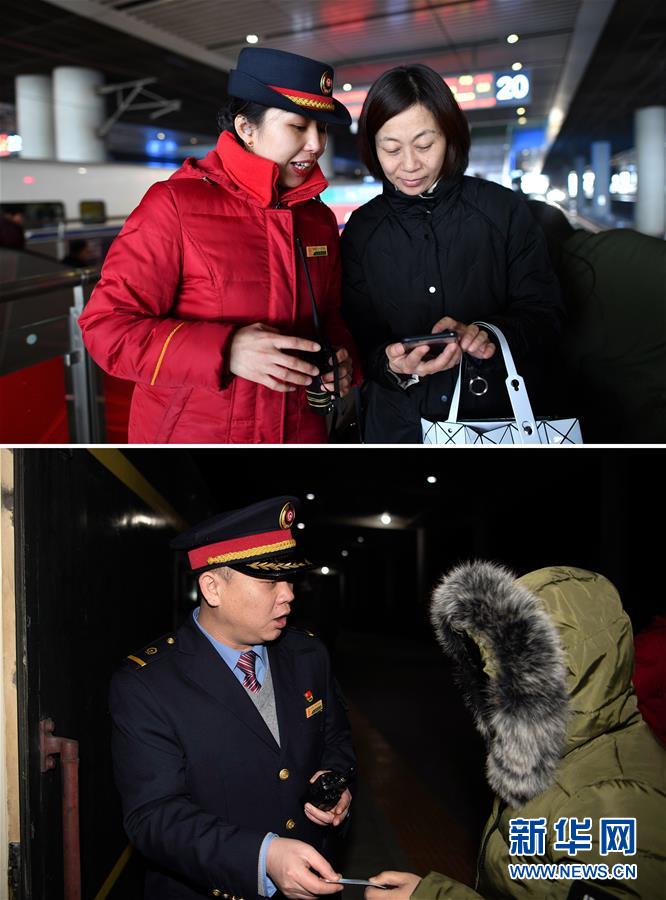 拼版照片上圖:在西安北站,列車長陳海燕(左)幫助旅客在手機(jī)上購買火車票(新華社記者詹彥1月11日攝);下圖:在陽泉北站,列車長趙耀(左)為旅客檢票(新華社記者楊晨光1月11日攝)。新華社發(fā)
