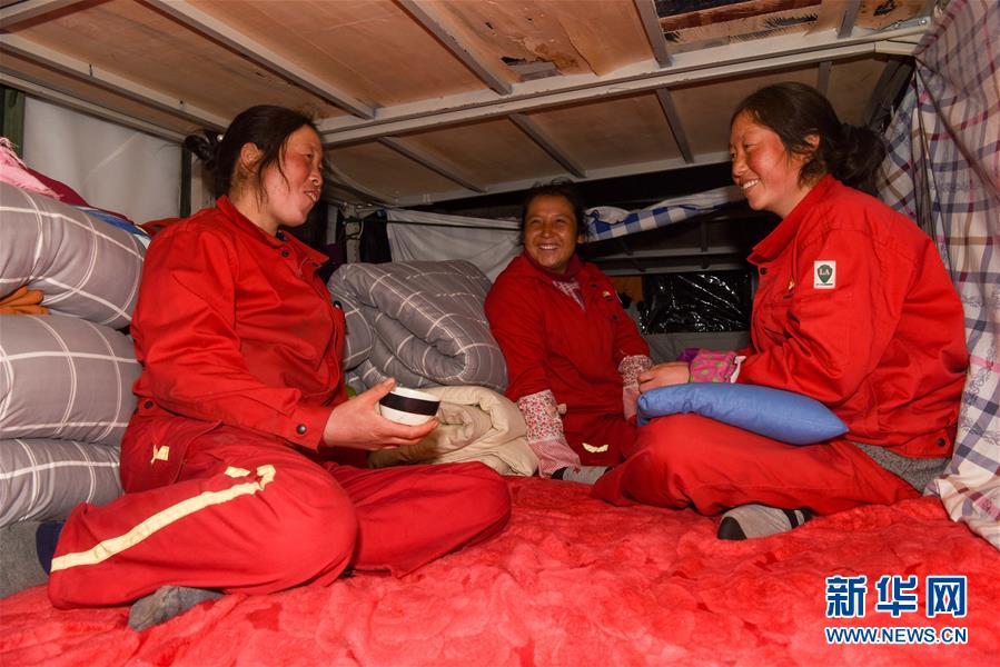 來自青海的放線工尚國青(中)三姐妹晚上在宿舍休息聊天(1月15日攝)。 新華社記者 丁磊 攝