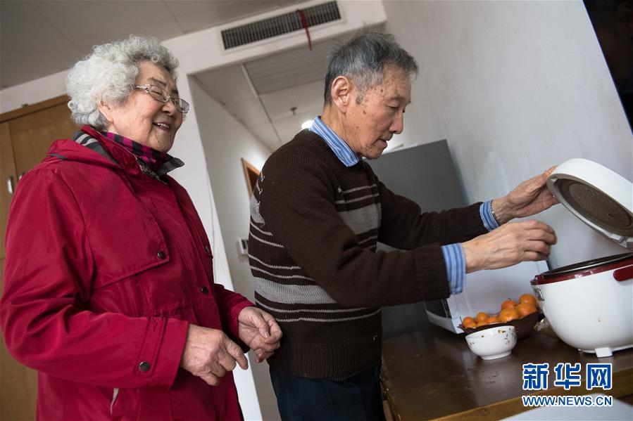 1月17日,王育華(左)和丈夫李偉光在杭州市社會(huì)福利中心宿舍吃午飯。新華社記者 翁忻旸 攝