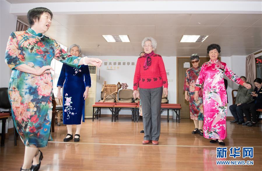 1月17日,王育華(中)向杭州市社會(huì)福利中心模特隊(duì)隊(duì)員學(xué)習(xí)走臺(tái)步。新華社記者 翁忻旸 攝