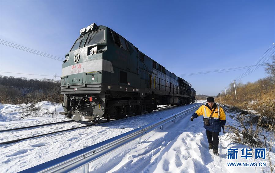 送水員黃衛(wèi)東在雪地中前行,準(zhǔn)備登上火車前往送水地點(1月17日攝)。新華社記者 許暢 攝