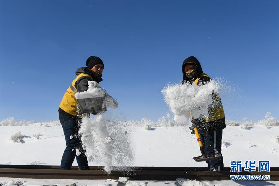 1月13日,白音庫倫綜合維修車間職工在作業(yè)點清理積雪。新華社記者劉磊攝