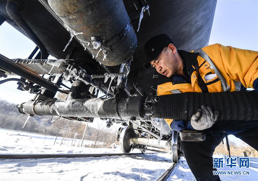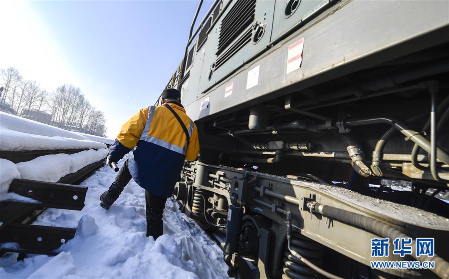 林海間的“送水小火車”調(diào)車員對“送水小火車”進行出行前的檢查作業(yè)(1月17日攝)。新華社記者許暢攝