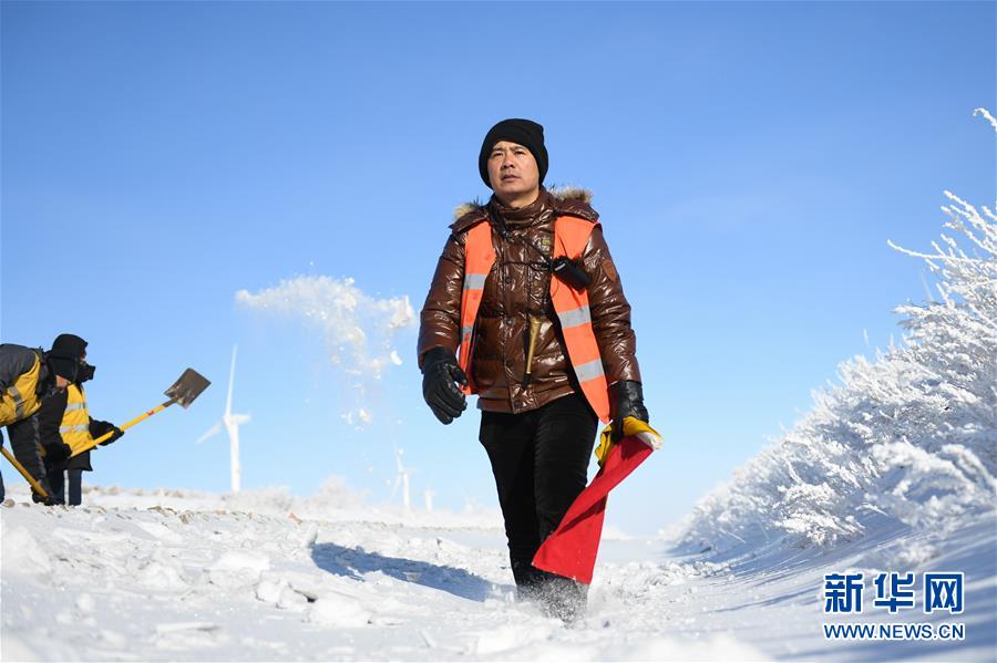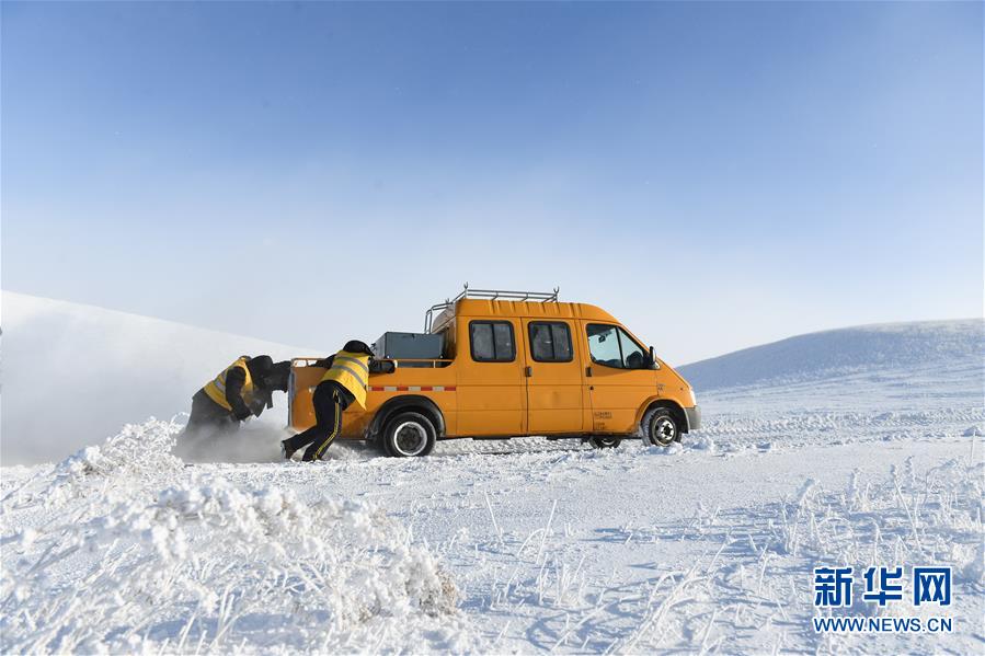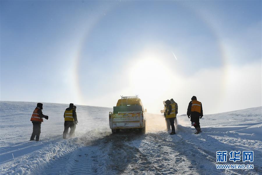 1月13日,車輛在途中打滑,白音庫倫綜合維修車間的職工們查看路況。新華社記者劉磊攝