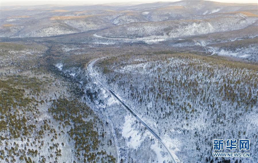 1月6日,一輛列車穿行在西羅奇維修工隊管區(qū)的林海雪原上(無人機照片)。新華社記者才揚攝