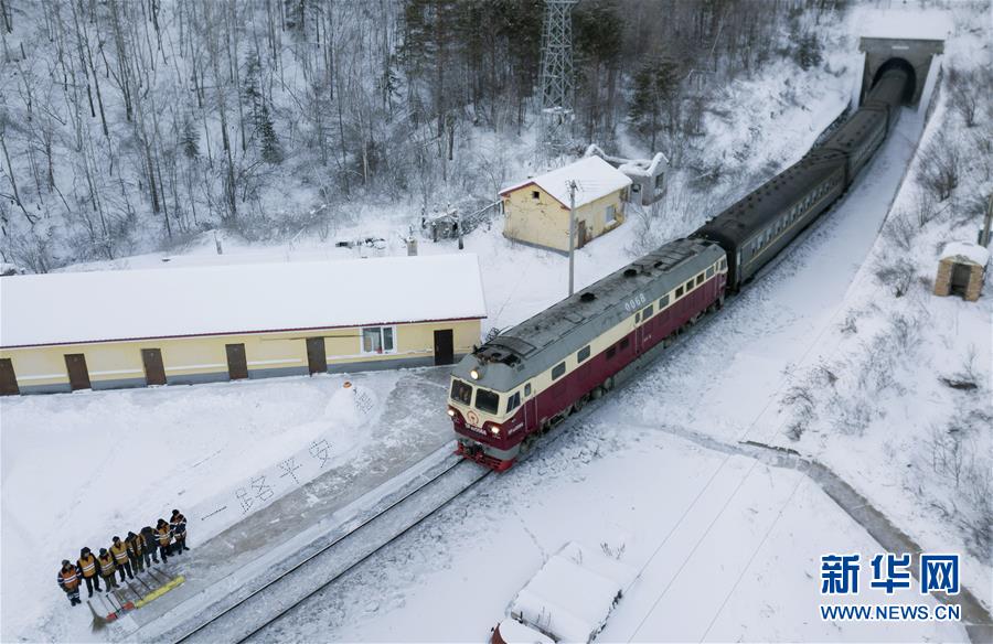 1月7日,西羅奇維修工隊工作人員在雪地上寫下“一路平安”為經(jīng)過的列車旅客送上祝福(無人機照片)。新華社記者王毓國攝