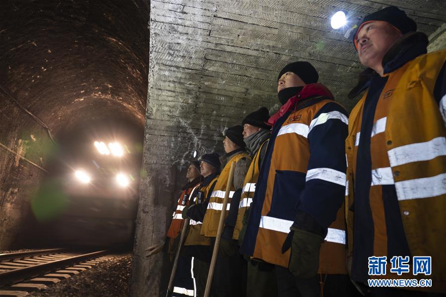 1月9日,在加格達奇工務(wù)段西羅奇嶺二號隧道,西羅奇維修工隊工作人員在避車洞內(nèi)躲避列車。新華社記者王毓國攝