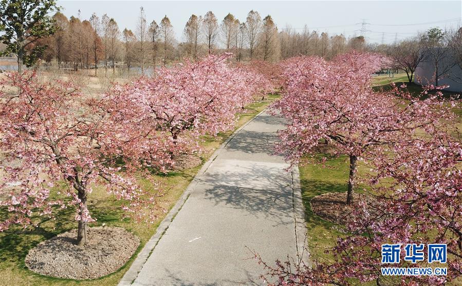 這是2月24日在上海松江辰山植物園內(nèi)拍攝的櫻花小徑(無人機(jī)照片)。 新華社記者 方喆 攝