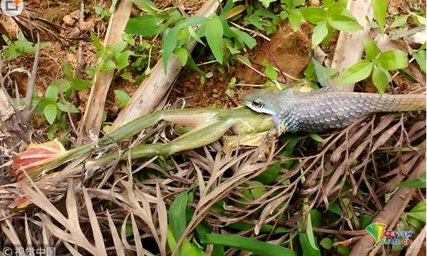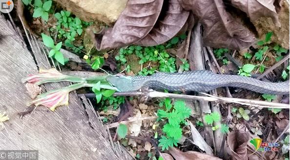 2018年7月18日,廣東東莞,藍(lán)綠鵲與蛇的地盤爭(zhēng)斗。