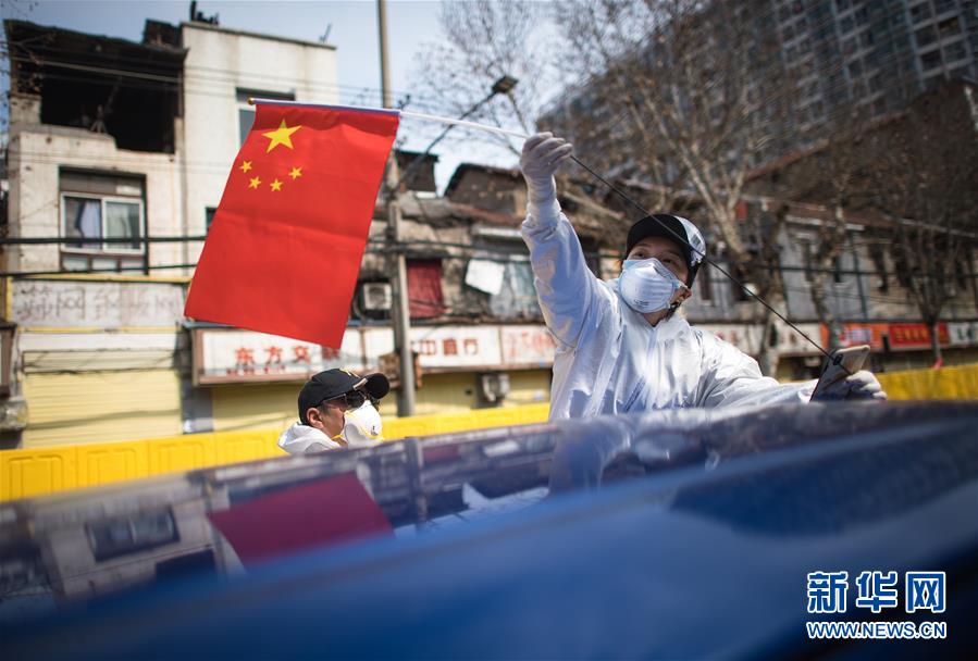 2月29日,W大武漢緊急救援隊(duì)隊(duì)長(zhǎng)王紫懿(右)將國(guó)旗插在車上。 新華社記者 肖藝九 攝