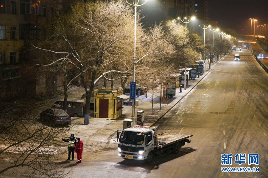 李可心(左)在出入口值守(3月1日攝)。 新華社記者王松攝
