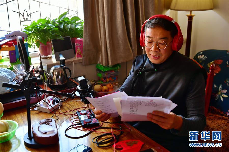 武凌云在直播中為戲迷講解劇本的創(chuàng)作過程(3月5日攝)。 新華社記者 曹陽(yáng) 攝