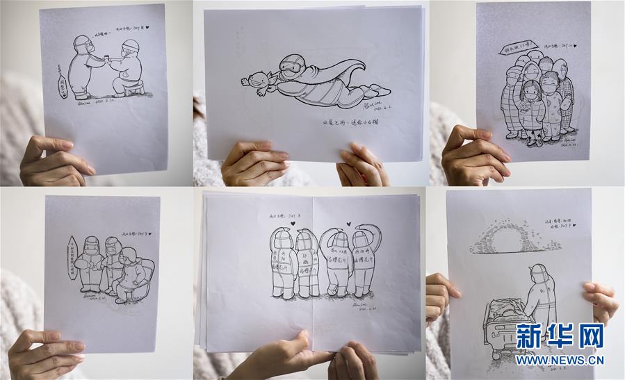 3月13日,黎婧展示自己在疫情期間創(chuàng)作的插畫(拼版照片)。 3月12日,插畫師黎婧和84位病友離開自己居住的武漢軟件工程職業(yè)學(xué)院康復(fù)驛站,回到自己家中。他們都是治愈出院的新冠病毒肺炎患者,已經(jīng)在武漢軟件工程職業(yè)學(xué)院康復(fù)驛站進(jìn)行了14天醫(yī)學(xué)觀察,達(dá)到醫(yī)學(xué)標(biāo)準(zhǔn),成功解除隔離。他們由專車運送至所屬社區(qū)附近的集散點后,在社區(qū)工作人員的陪同下回家。 新華社記者 肖藝九 攝