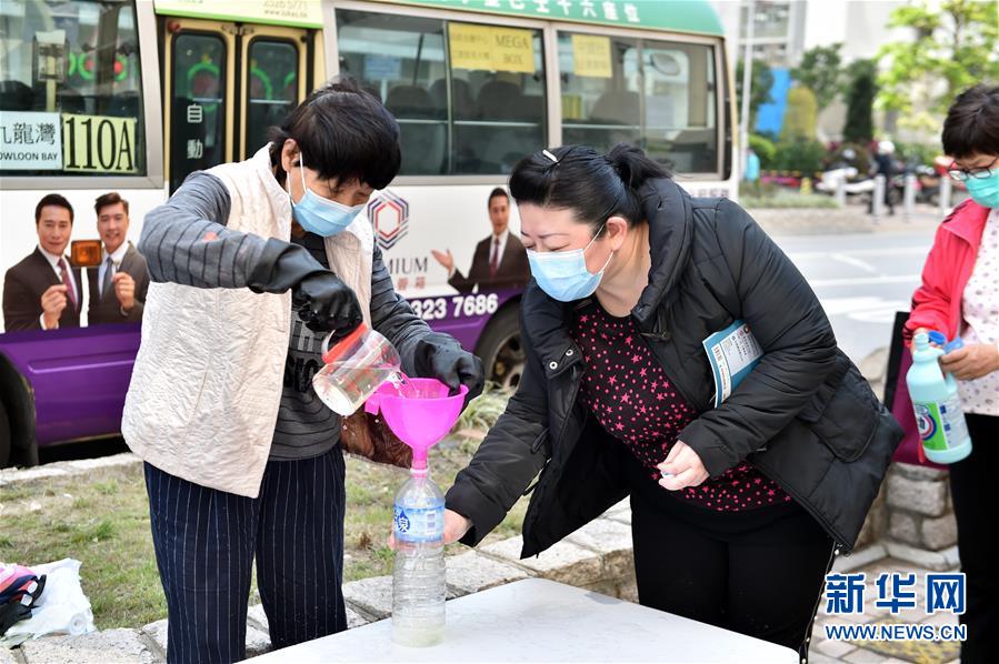 2月23日,市民領(lǐng)取消毒清潔劑。在將軍澳向市民免費派發(fā)消毒清潔劑。當日,香港工聯(lián)會新華社記者盧炳輝攝