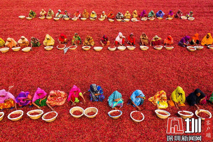 航拍孟加拉國(guó)工人分揀辣椒 滿眼火紅大地如鋪上地毯