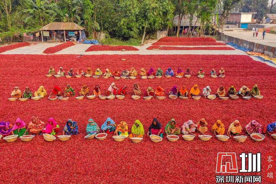 航拍孟加拉國工人分揀辣椒 滿眼火紅大地如鋪上地毯