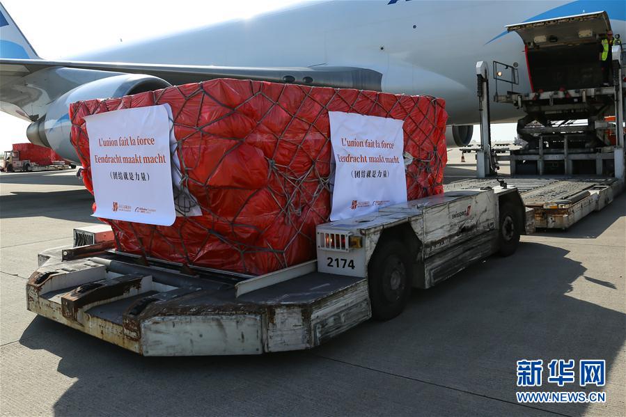 來(lái)自中國(guó)的30萬(wàn)只口罩當(dāng)?shù)貢r(shí)間16日中午運(yùn)抵比利時(shí)列日機(jī)場(chǎng)。 新華社記者 張鋮 攝