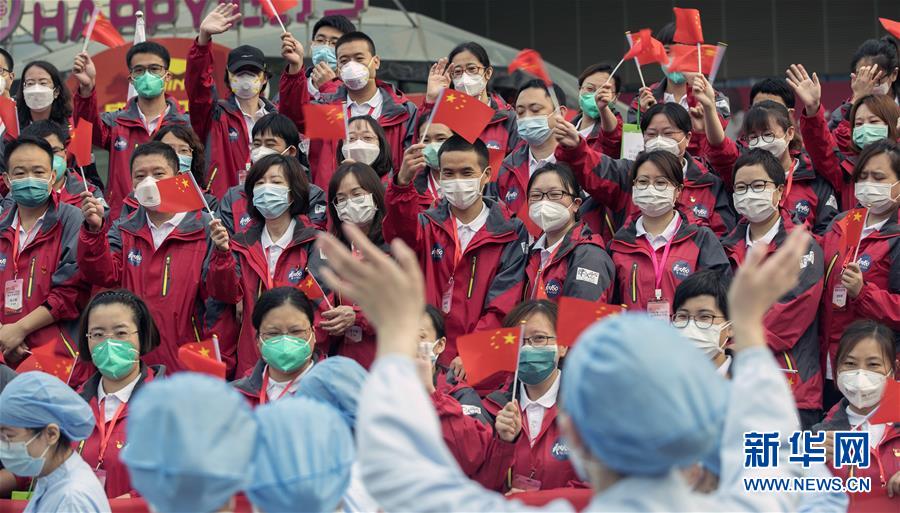 3月21日,武漢市第一醫(yī)院的醫(yī)護(hù)人員(前)送別天津市醫(yī)療隊(duì)隊(duì)員。新華社記者費(fèi)茂華攝