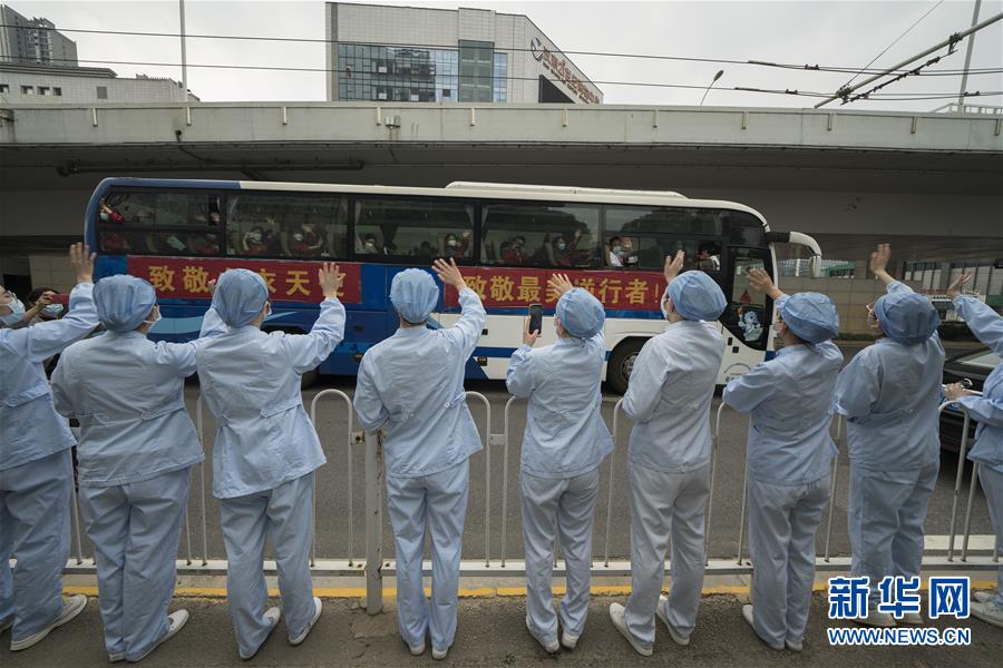3月21日,武漢市第一醫(yī)院的醫(yī)護(hù)人員(前)送別天津市醫(yī)療隊(duì)隊(duì)員。新華社記者費(fèi)茂華攝