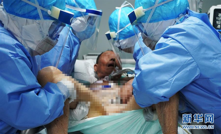 四名護士一起調整患者的身體姿態(tài)(3月20日攝)。 武漢火神山醫(yī)院重癥醫(yī)學一科的護理團隊共50名護士,其中絕大多數(shù)是80后、90后女性,她們不懼危險,奮戰(zhàn)在抗擊疫情的最前沿“紅區(qū)”。 新華社記者王毓國攝