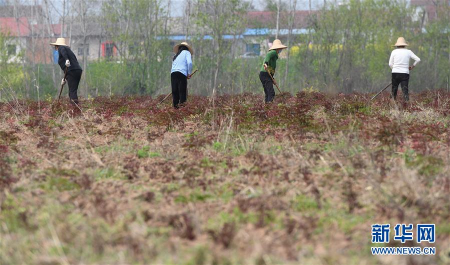 湖北當陽市壩陵辦事處群華村農民在中藥材白芍田里除草(3月21日攝)。近日,湖北當陽市農業(yè)生產和農產品加工加速恢復。截至3月19日,當陽市86家規(guī)上農產品加工企業(yè)復工復產率為84.9%,51家農業(yè)產業(yè)化重點龍頭企業(yè)有48家復工復產,占比達94.1%。新華社記者程敏攝