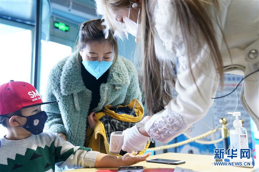 3月23日,在哈爾濱極地館入口,工作人員在給游客測量體溫。當日,哈爾濱極地館恢復(fù)營業(yè)。目前,極地館日接待人數(shù)不超過400人,園區(qū)采取分時段、間隔性辦法安排游客有序入園。游客實名預(yù)訂門票,入園要配合測溫、佩戴口罩、掃描“龍江健康碼”,刷身份證入館。新華社記者王建威攝