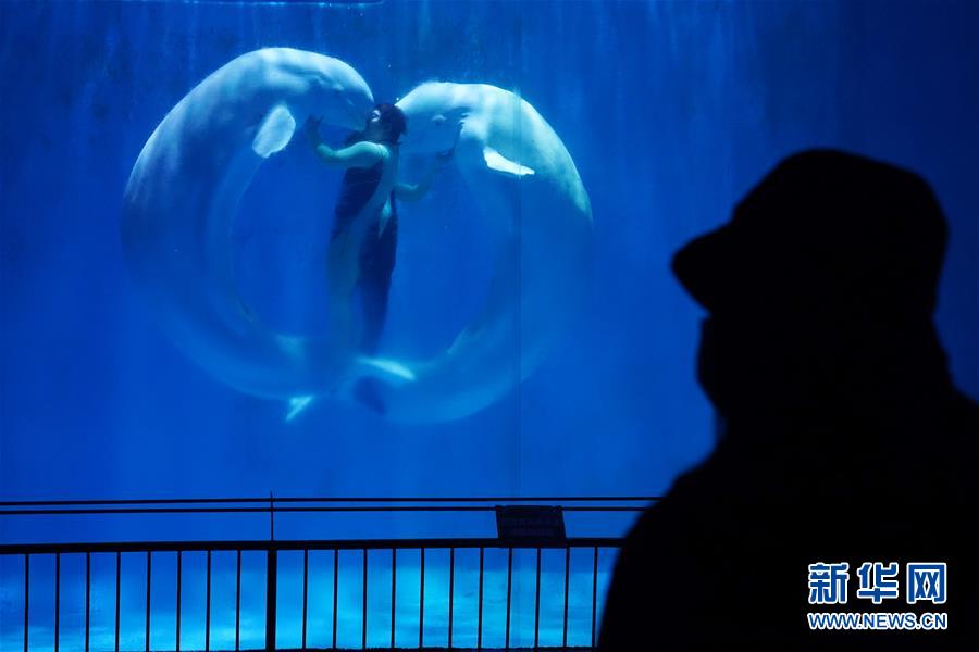 3月23日,游客在哈爾濱極地館觀賞白鯨表演。當(dāng)日,哈爾濱極地館恢復(fù)營業(yè)。目前,極地館日接待人數(shù)不超過400人,園區(qū)采取分時段、間隔性辦法安排游客有序入園。游客實名預(yù)訂門票,入園要配合測溫、佩戴口罩、掃描“龍江健康碼”,刷身份證入館。新華社記者王建威攝