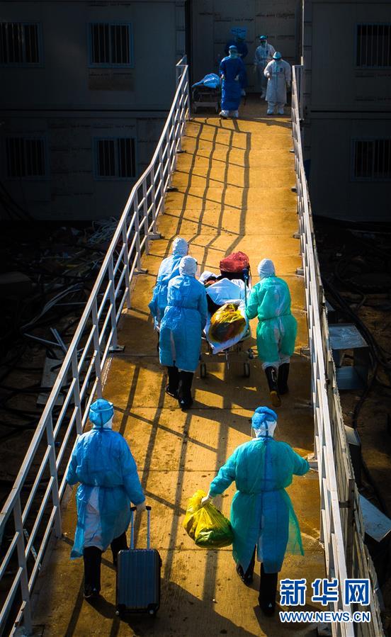 醫(yī)護(hù)人員將患者轉(zhuǎn)運(yùn)至武漢火神山醫(yī)院病房(2月4日攝,無人機(jī)照片)。新華社記者肖藝九攝
