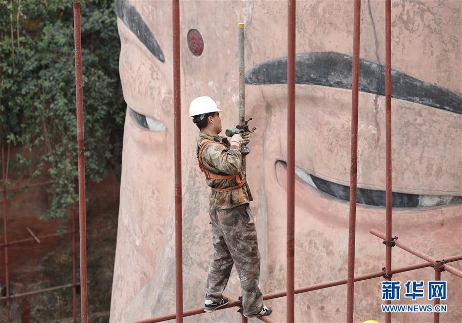 中鐵西北科學研究院有限公司文保中心的工作人員在拆除施工腳手架(3月19日攝)。新華社記者江宏景攝