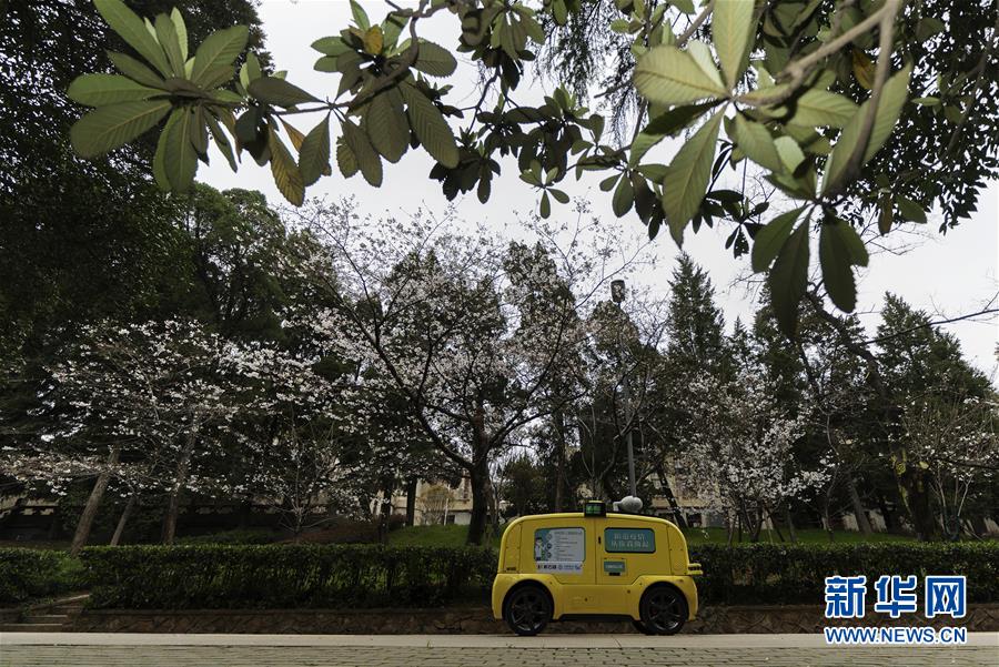 一輛5G無人攝像車在武漢大學(xué)櫻花大道進(jìn)行不間斷無人巡游,實(shí)時采集和傳輸直播圖像信號(3月16日攝)。新華社記者費(fèi)茂華攝