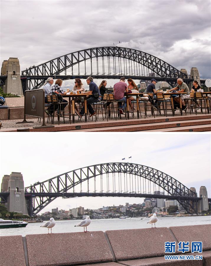 拼版照片顯示:(上)3月10日,人們在澳大利亞悉尼海港大橋附近用餐。 (下)3月24日,澳大利亞悉尼海港大橋附近空無一人。  新華社記者 白雪飛 攝