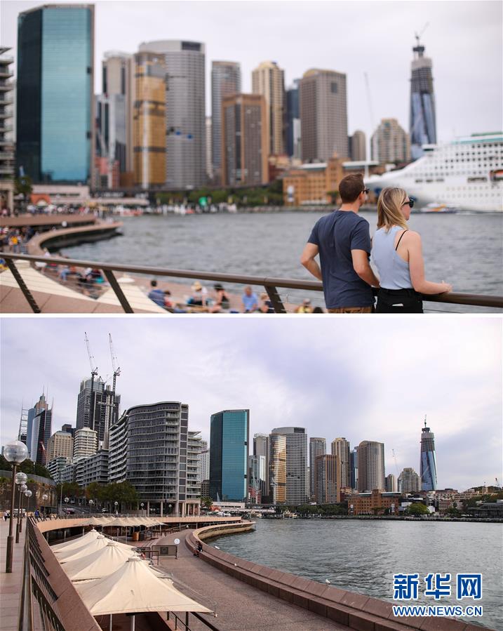 拼版照片顯示:(上)3月10日,澳大利亞悉尼環(huán)形碼頭的餐廳顧客滿座。(下)3月24日,澳大利亞悉尼環(huán)形碼頭的餐廳已關(guān)閉。  新華社記者 白雪飛 攝
