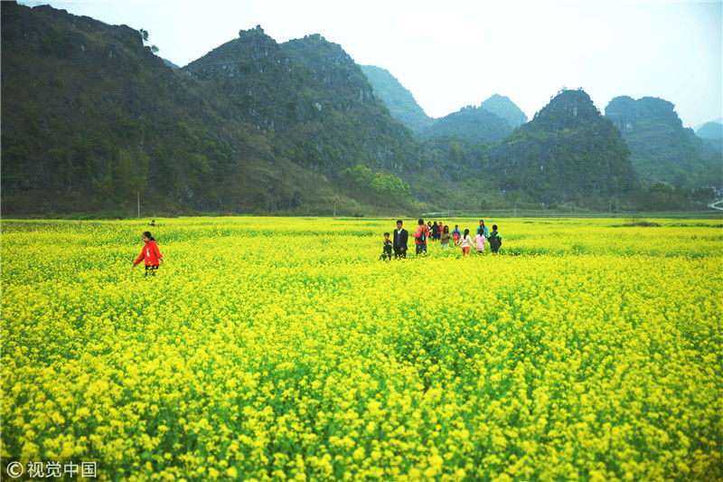 2019年2月5日,廣西來賓,當(dāng)天是農(nóng)歷大年初一,人們在忻城縣城關(guān)鎮(zhèn)隆光村油菜花海中賞花游玩。
