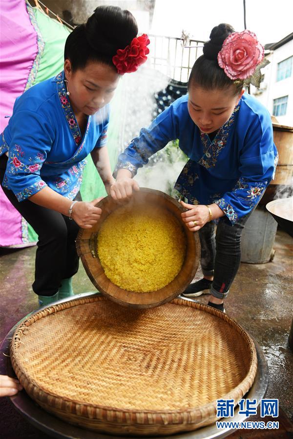 4月17日,在貴州省臺江縣姊妹街哆蝶五彩姊妹飯體驗店,苗家婦女將蒸熟的五彩“姊妹飯”進行攤晾。新華社記者楊文斌攝