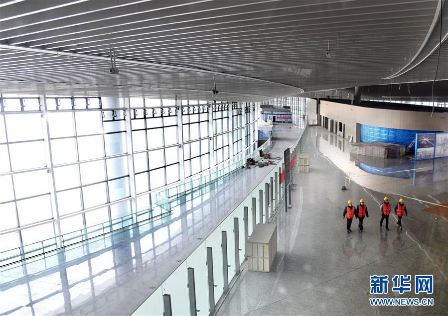 3月25日,幾名工人從建設(shè)中的青島膠東國際機(jī)場(chǎng)航站樓出發(fā)大廳走過。新華社記者李紫恒攝