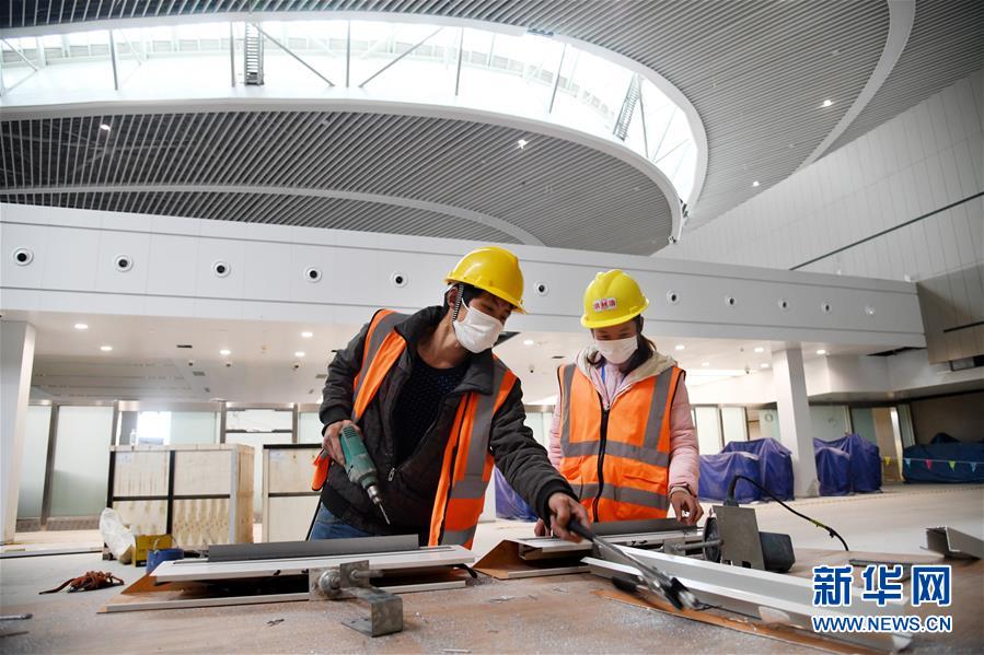 3月25日,兩名工人在青島膠東國際機(jī)場(chǎng)航站樓中央景觀區(qū)施工。新華社記者李紫恒攝