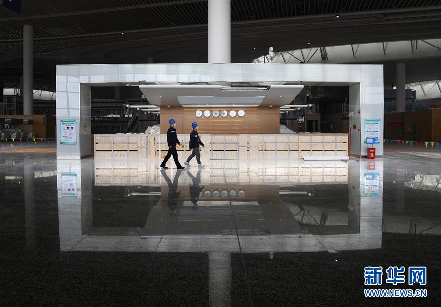 3月25日,兩名工程技術(shù)人員從建設(shè)中的青島膠東國際機(jī)場(chǎng)航站樓出發(fā)大廳走過。新華社記者李紫恒攝