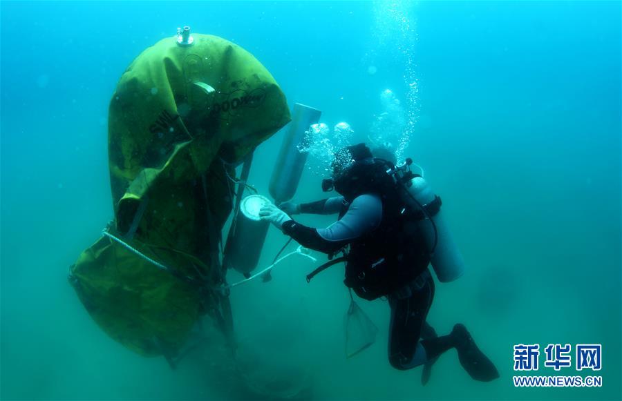 在位于海南三亞蜈支洲島旅游區(qū)的海洋牧場,工作人員在為浮力袋充氣后,浮力袋帶著固定好的人工魚礁上?。?月27日攝)。近日,位于海南三亞蜈支洲島旅游區(qū)的海洋牧場復(fù)工,海底作業(yè)逐漸恢復(fù)正常,開始進行人工魚礁吊裝擺位、水下監(jiān)控清理以及日常巡護等工作。據(jù)介紹,人工魚礁有利于魚類種類增加和數(shù)量提高,蜈支洲島海域海洋牧場人工魚礁表面附著珊瑚、貝類、藻類等生物種類達120余種。新華社記者楊冠宇攝