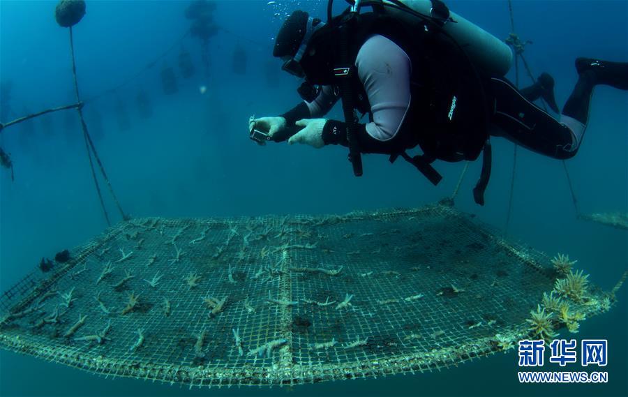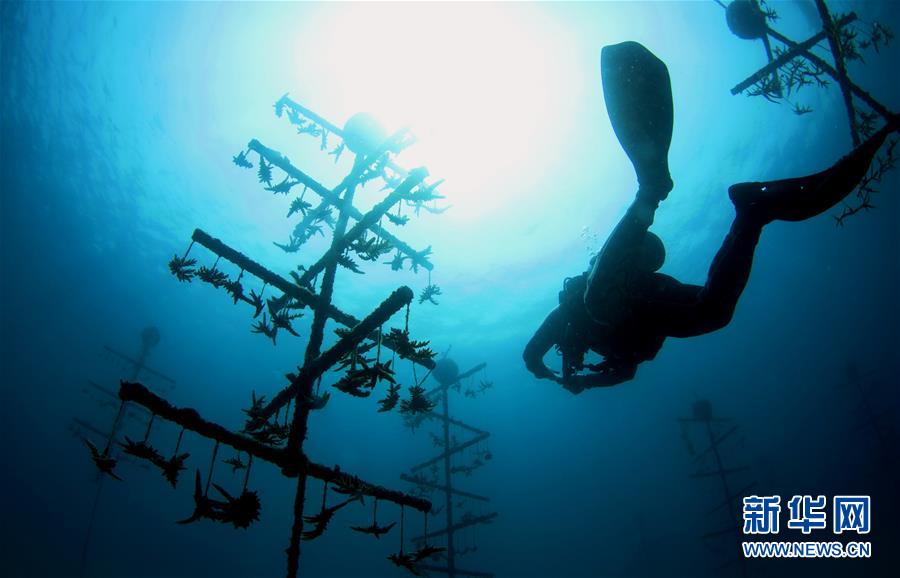 3月28日,在位于海南三亞蜈支洲島旅游區(qū)的海洋牧場,工作人員在清理附著在珊瑚上的漁網(wǎng)。近日,位于海南三亞蜈支洲島旅游區(qū)的海洋牧場復(fù)工,海底作業(yè)逐漸恢復(fù)正常,開始進行人工魚礁吊裝擺位、水下監(jiān)控清理以及日常巡護等工作。據(jù)介紹,人工魚礁有利于魚類種類增加和數(shù)量提高,蜈支洲島海域海洋牧場人工魚礁表面附著珊瑚、貝類、藻類等生物種類達120余種。新華社記者楊冠宇攝