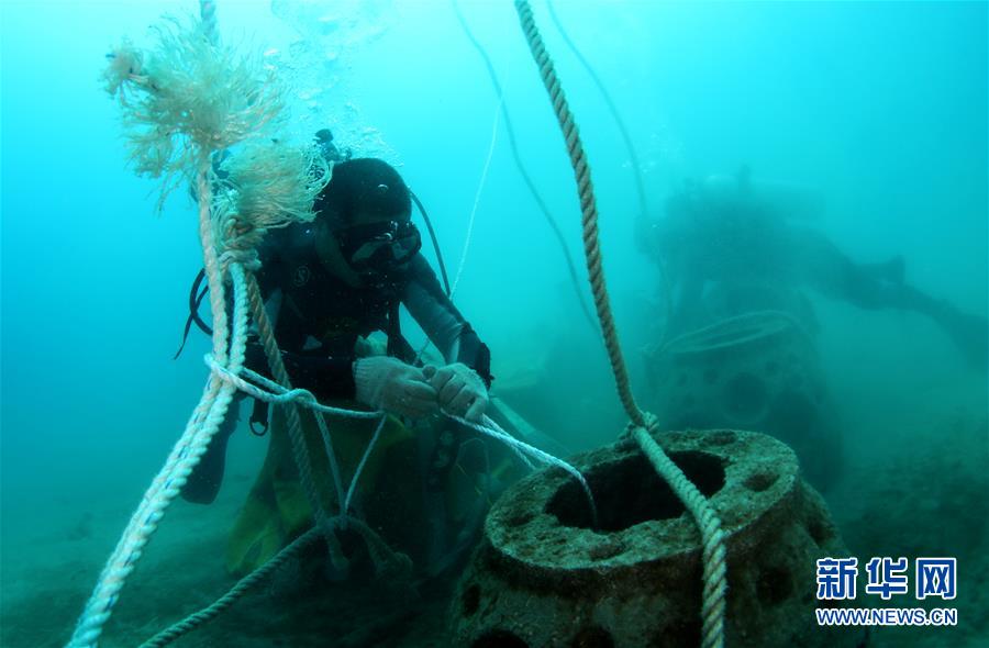3月28日,在位于海南三亞蜈支洲島旅游區(qū)的海洋牧場,工作人員在海底用繩子綁住人工魚礁,準(zhǔn)備進行吊裝擺位作業(yè)。近日,位于海南三亞蜈支洲島旅游區(qū)的海洋牧場復(fù)工,海底作業(yè)逐漸恢復(fù)正常,開始進行人工魚礁吊裝擺位、水下監(jiān)控清理以及日常巡護等工作。據(jù)介紹,人工魚礁有利于魚類種類增加和數(shù)量提高,蜈支洲島海域海洋牧場人工魚礁表面附著珊瑚、貝類、藻類等生物種類達120余種。新華社記者楊冠宇攝