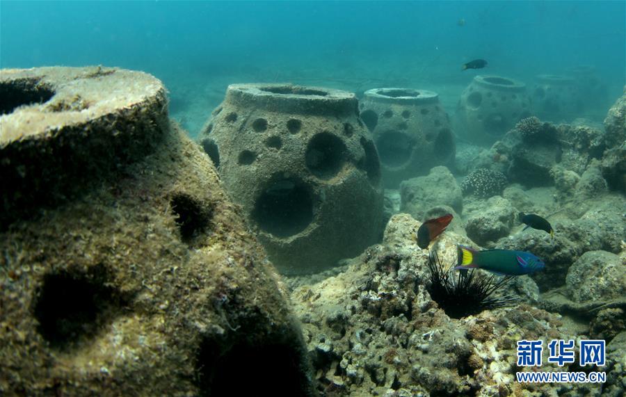 3月28日,在位于海南三亞蜈支洲島旅游區(qū)的海洋牧場,工作人員將人工魚礁有序擺放在海底,人工魚礁吊裝擺位作業(yè)完成。近日,位于海南三亞蜈支洲島旅游區(qū)的海洋牧場復(fù)工,海底作業(yè)逐漸恢復(fù)正常,開始進行人工魚礁吊裝擺位、水下監(jiān)控清理以及日常巡護等工作。據(jù)介紹,人工魚礁有利于魚類種類增加和數(shù)量提高,蜈支洲島海域海洋牧場人工魚礁表面附著珊瑚、貝類、藻類等生物種類達120余種。新華社記者楊冠宇攝