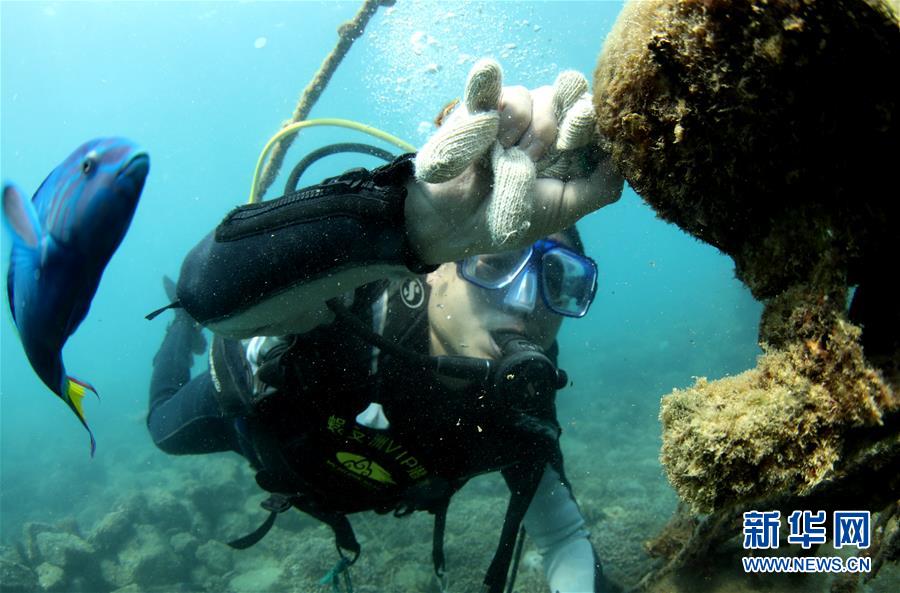 在位于海南三亞蜈支洲島旅游區(qū)的海洋牧場,工作人員在清理監(jiān)控設備(3月27日攝)。近日,位于海南三亞蜈支洲島旅游區(qū)的海洋牧場復工,海底作業(yè)逐漸恢復正常,開始進行人工魚礁吊裝擺位、水下監(jiān)控清理以及日常巡護等工作。據介紹,人工魚礁有利于魚類種類增加和數量提高,蜈支洲島海域海洋牧場人工魚礁表面附著珊瑚、貝類、藻類等生物種類達120余種。新華社記者楊冠宇攝