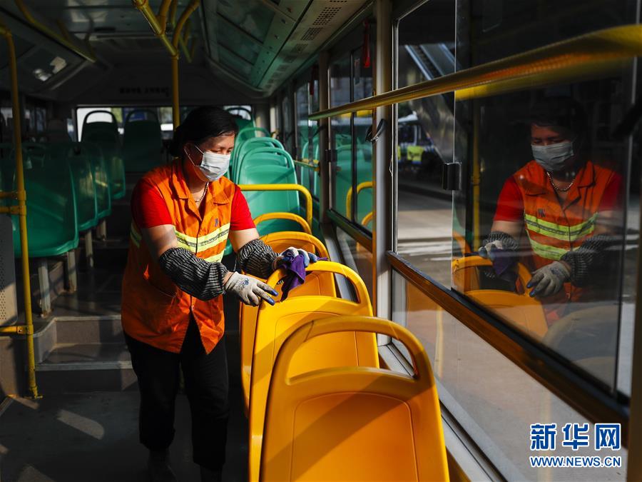 3月23日,武漢公交集團站務(wù)公司保潔員趙真香在清潔518路公交車。新華社記者沈伯韓攝