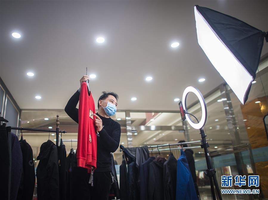 3月29日,在漢口北市場,一名主播在直播平臺直播銷售一款服裝。新華社記者肖藝九攝